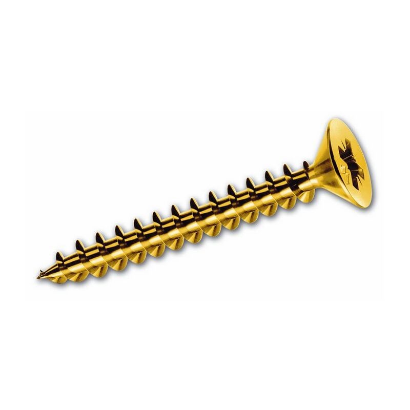 Testa cava croce - Vite universale per l'avvitamento su: pannelli truciolari, legni naturali duri e teneri - Trattamento galvanico di ottonatura (7 micron rame, nichel, ottone) - Laccata lucida Confezione: 500 pz Misura 4,5x40 mm.
