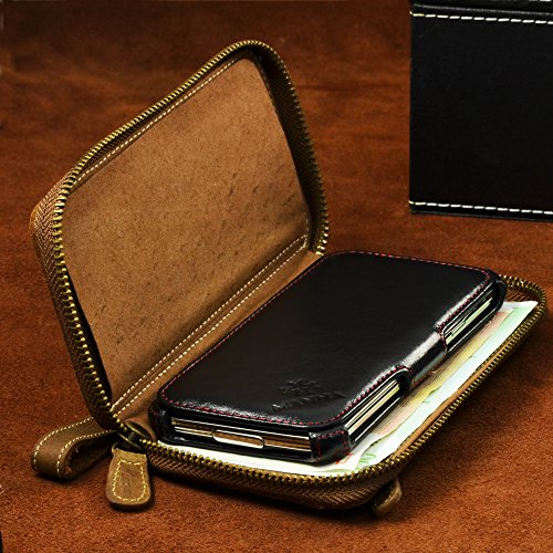Vano principale per alloggiare l´iPhone rivestito in vera pelle con fanno copri display in pelle, vano porta soldi con chiusura a cerniera e slot per carte di credito e patenrte