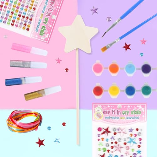 [Facile da usare]: Il bacchette magiche in legno include tutto il necessario per creare le tue stelle fai-da-te, 12 bacchette, 24 nastri, 2 adesivi di diamanti, 12 colori di vernice, 2 pennelli, 4 colori di colla a base di oro.