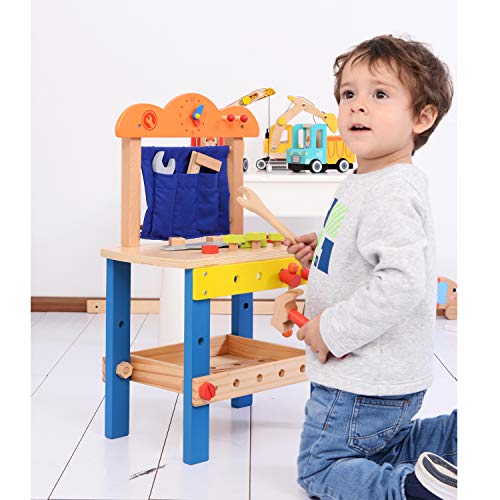 La confezione contiene i seguenti strumenti realizzati in legno: martello, sega, chiave inglese, cacciavite, righello e morsa. Sono inclusi anche dadi, bulloni, chiodi e gli accessori nella foto.