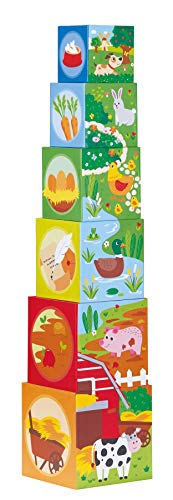 Fascia di età e dimensioni: adatto per bambini dai 12 mesi in su. Dimensioni: lunghezza 12 cm x larghezza 12 cm x altezza 58 cm circa. Il set include 6 cubetti di cartone e 6 animali da fattoria