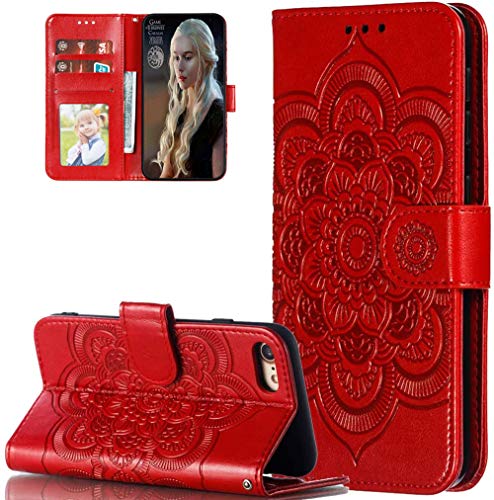 LEMAXELERS Custodia iPhone SE 2020 / iPhone 8 / iPhone 7 Cover Portafoglio,iPhone 8 Custodia Fiore Mandala Rilievo Wallet Shock-Absorption Magnetica Supporto Bumper Leather Flip Cover,LD Mandala Red