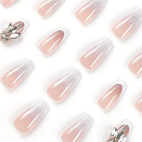 LEMEIZ Pink Ombre White French Press on Nails with Rhinestone, White Outlined Pink False Nails, Medium Coffin Press on Shimmer Nails Art Glitter, 12 sizes, 24 pieces LEMEIZ-ST021