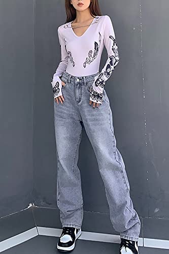 S.lemon Farfalla Posteriore Stampata Y2K Anni 90 Gamba Larga Vita Alta Dritti Larghi Boyfrined Jeans da Donna Blu L