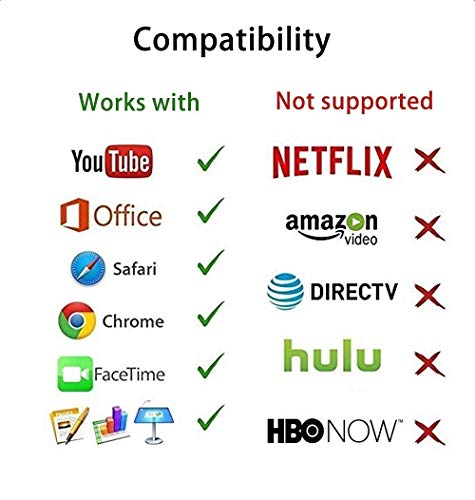 Non compatibile con quelle APP: Netflix, Amazon Video, DIRECTV, Hulu, HBO, Xfinity Player, grazie alla loro protezione DRM sui loro servizi.