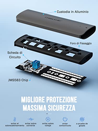 【Trasmissione Ultraveloce a 10 Gbps】: È supporta USB 3.1 Gen2, PCI-e Gen3 e UASP e Trim ready. Supporta una velocità di trasferimento dati di 10 Gbps, questo NVMe M.2 a Type-C USB3.1 Gen2 trasferisce file da 10 GB in 10 secondi. La custodia NVMe SSD usb adattatore presenta un chipset JMS583 avanzato per migliorare la velocità di trasmissione dei dati e garantisce la sicurezza dell'unità SSD M.2 PCI-e NVMe e dei dati preziosi.