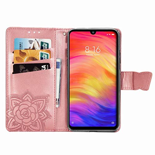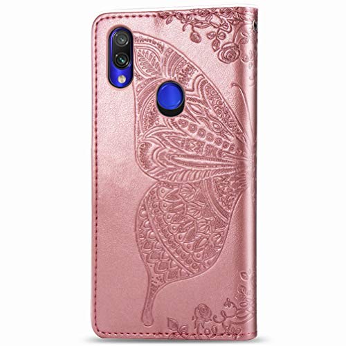 LEMORRY Farfalla Cover per Xiaomi Redmi Note 7 Custodia Pelle Cuoio Portafoglio con Slot per Schede Protettivo Gomma Stand Magnetico Morbido Silicone TPU Custodia Redmi Note 7, Oro Rosa