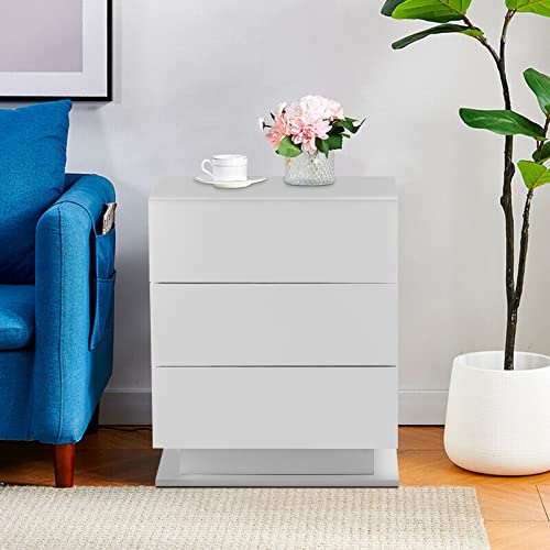 Lemroe - Comodino con luci LED USB, 3 cassetti, con pannello frontale lucido da 15 mm in MDF, cassettiera per camera da letto, colore bianco, parte inferiore con luci