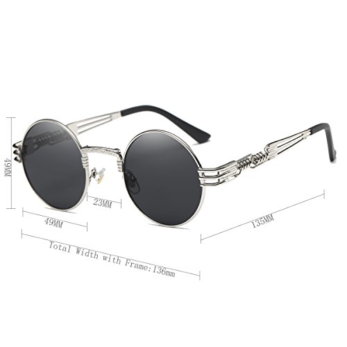 John Lennon Style Retro Steampunk Occhiali da sole per le donne e gli uomini rotondi Hippie UV400 Protezione Flat Lens Metal Frame Eyewear, Lente nera/montatura argento,