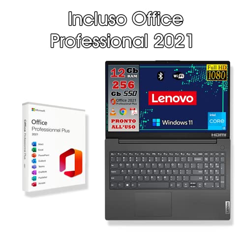 Lenovo Notebook Monitor 15.6" Full HD Intel Core i3 11th fino a 4,1ghz Ram 12GB SSD 256GB Pacchetto Office Pro 2021 Windows 11 pro PRONTO ALL'USO - MOUSE WIRELESS e Kit esterno con HDD da 500 Gb