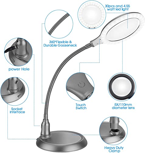 ZHSX Lente Ingrandimento con Luce, 5X Dimmable Lente Ingrandimento Con Luce e Stand Per Lettura, Lente di Ingrandimento Tocca Dimmerabile con 30 luci a LED per Lavori Ravvicinati Lettura - Grigio