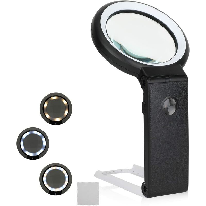 Diametro lente: 80 mm, 21 mm.La lente d'ingrandimento illuminata 6x per la lettura, la lente d'ingrandimento 25x per i dettagli più fini.Materiale: ABS e lente in vetro ottico. Illuminazione: 8 luci a LED assicurano un'area di visualizzazione uniformemente illuminata.Questa lente d'ingrandimento illuminata ha quattro livelli di luce regolabili per diversi scenari. la lente d'ingrandimento illumina l'ambiente di lavoro, migliora il comfort dell'utente, protegge gli occhi e previene l'affaticamento degli occhi. Lente d'ingrandimento illuminata portatile multifunzionaleQuattro tipi di commutazione della sorgente luminosa a LED: luce fredda, luce calda, luce mista fredda e calda, luce LED sull'impugnatura. Supporto pieghevole e scala di marcatura: Facile da usare, con un supporto pieghevole, può essere regolato a qualsiasi altezza in base alle proprie esigenze, è facile da trasportare e può essere utilizzato come