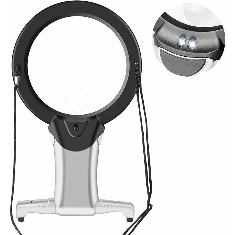 Ingrandimento 2,5X 6X Questa lente d'ingrandimento illuminata ha una grande lente principale da 105 mm che può ingrandire fino al 200%. La lente ausiliaria può ingrandire fino al 600%. È ideale per leggere giornali a stampa fine e persone ipovedenti con occhi che invecchiano. Luce LED ad alta luminosità: la nostra lente d'ingrandimento illuminata ha due luci LED bianche per fornire l'illuminazione migliore, più conveniente ed economica in la lunga corsa. vita utile. Le luci a LED forniscono una buona illuminazione per garantire una visione chiara di notte senza disturbare gli altri. 【Lente d'ingrandimento a mani libere】 Questa lente d'ingrandimento illuminata viene fornita con un cordino per il collo e un telaio di supporto per il collo.petto con morbidi piedini imbottiti. Puoi appenderlo al collo con una lente d'ingrandimento sul petto per leggere, ricamare e cucire a mani libere. Multiuso: questa lente d'ingrandimento illuminata non solo ti aiuta a ritrovare la chiarezza durante il