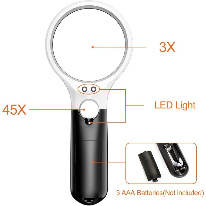 Alto ingrandimento - Ingrandimento 3x e 45x, ingrandimento chiaro e confortevole soddisfa le tue esigenze visive 【Eccellente design di illuminazione brillante】 Dotato di 3 luci LED super luminose, che forniscono una buona illuminazione, consentendoti di leggere il buio per molto tempo 【Materiale dell'obiettivo premium】L'obiettivo in vetro ottico premium da 70 mm e l'obiettivo in plexiglass da 22 mm sono durevoli e resistenti ai graffi 【Design perfetto del manico fatto a mano】Il manico ha una comoda impugnatura ergonomica e il design concavo e convesso ti consentono di tenerlo facilmente ed evitare che cada. 【Ampio utilizzo】 Perfetto per leggere giornali, parti elettroniche, mappe, gioielli, visualizzare caratteri piccoli, artigianato, piante e altre piccole scene.