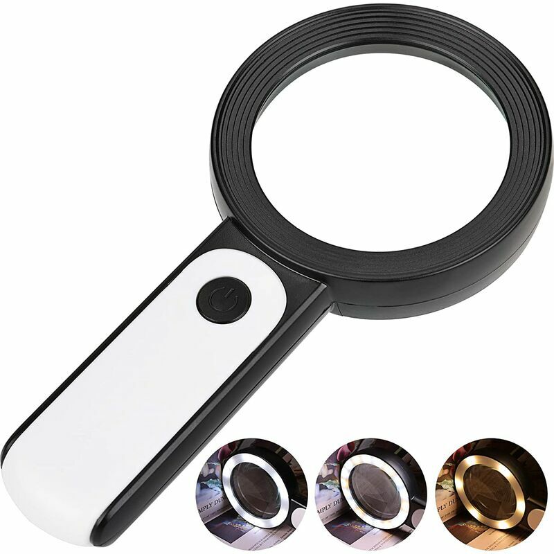 LEnte d'ingrandimento 30X CON 18 LUCI LED Questa lente d'ingrandimento è dotata di 18 luci LED. è composto da 12 luci LED bianche e 6 luci calde con 3 modalità di illuminazione (luce bianca. luce calda. luce bianca calda). Le 3 modalità possono essere commutate in base alle diverse condizioni di luce. che può ridurre l'affaticamento degli occhi. che è molto utile per le persone con degenerazione maculare o miopia/feyopia. Ingrandisce 30X SENZA DISTORSIONEAiuta gli anziani e gli ipovedenti a leggere facilmente e chiaramente.È molto adatto all'usoIdeale per visualizzare dettagli fini nei libri. giornali. riviste. le carte. elettronica. le miniature. gioielleria. flaconi di pillole. hobby e artigianato. FUNZIONAMENTO CON UN PULSANTE La lente d'ingrandimento Woridarex viene fornita completamente assemblata senza batterie. Il controllo della sorgente luminosa a LED adotta un interruttore a pressione a quattro fasi comandato da un semplice pulsante di accensione/spegnimento. Basta caricare