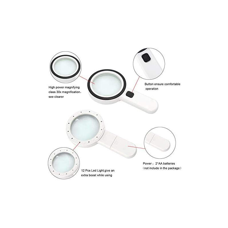 INGRANDIMENTO 30X AD ALTA POTENZA -- Queste lenti a doppio pannello dotate di lente d'ingrandimento forniscono un effetto di ingrandimento 30X per aiutare gli ipovedenti a vedere i minimi dettagli, utilizzare questa lente d'ingrandimento per leggere mappe, eseguire lavori di precisione o ingrandire qualsiasi testo più visibile e più facile da leggere. LUCE LED INCORPORATA -- Questa lente d'ingrandimento portatile con 12 luci LED per illuminare in condizioni di scarsa illuminazione, leggere al buio, la luce intensa dà un pollice in più quando è in uso, illumina bene ciò che stai guardando. Sono sufficienti due batterie AA, il design luminoso è l'ideale per viaggiare in macchina o leggere in luoghi bui, mentre l'interruttore rapido accende e spegne rapidamente la luce.MANIGLIA ERGONOMICA E FACILE DA USARE -- Lente d'ingrandimento trasparente con impugnatura ergonomica comoda, l'impugnatura è facile da impugnare e offre una sensazione confortevole nella mano, allevia la tensione durante