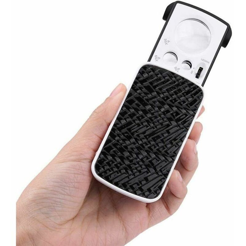 Protegge e rilassa gli occhi, previene il mal di testa! Non avrai più mal di testa quando leggi i caratteri piccoli di libri, giornali, ricevute, ricette e varie istruzioni per l'uso. È una lente d'ingrandimento portatile! Quando vai in vacanza, viaggi in aereo o in treno, fai shopping o addirittura mangi fuori, puoi metterlo in tasca o nel portafoglio. Caratteristiche: Lente d'ingrandimento multifunzione 30x: 3 ingrandimenti di 30X, 60X e 90X, i diametri delle lenti corrispondenti sono 25 mm, 12 mm e 8 mm. Dotato di doppie luci a LED che forniscono un'area di visualizzazione uniformemente illuminata anche in condizioni di scarsa illuminazione. Viene fornito anche con una luce nera UV per rilevare denaro contraffatto. Ampia gamma di usi: Questa lente d'ingrandimento portatile a LED può essere utilizzata per esaminare carte, gioielli, diamanti, gemme, monete, francobolli, pietre, artigianato, dettagli di documentazione e altro, adatto per anziani, hobbisti, gioiellieri, orologiai e