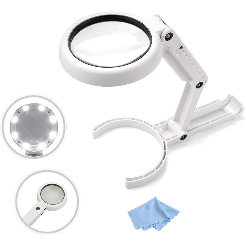 Lente d'ingrandimento tascabile o da tavolo - Questa lente d'ingrandimento può essere utilizzata in due modi. Basta allungare il supporto e posizionarlo sulla scrivania come lente d'ingrandimento da tavolo. Chiudere i supporti per fungere anche da lente d'ingrandimento portatile, che amplia l'ambito di applicazione. Alta qualità dell'obiettivo: la lente d'ingrandimento è rinforzata e ha una durezza fino a 5 ore, che è più resistente all'usura. Fornisce un ingrandimento dell'immagine più chiaro. C'è anche un panno per lenti nella confezione che ti consente di pulire l'obiettivo per darti un obiettivo più professionale senza deformazioni. 8 LED Bright Light - Questa lente d'ingrandimento ha 8 potenti lampade a LED ad alta efficienza energetica che fornire una luce intensa e consentire di lavorare al buio. Rendi il tuo ambiente di lavoro più confortevole, migliora la tua efficienza, proteggi efficacemente la vista e previene l'affaticamento degli occhi. Design a doppio circuito: la lente