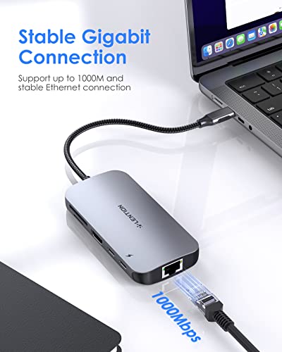 Espansione rapida - LENTION CE57se 9 in 1 USB C Hub espande l'USB C del tuo laptop a Ethernet, 4K HDMI, SD/Micro SD card, 100W USB C power delivery, 3 porte USB 3.0 e porta dati USB C. Gli slot per schede SD/Micro SD possono leggere e scrivere simultaneamente secondo lo standard UHS-I (fino a 104MB/s). L'hub USB C con Ethernet consente l'accesso Gigabit Ethernet cablato 10/100/1000 Mbps