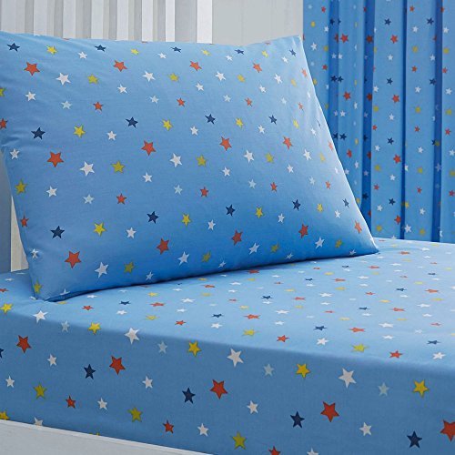 Lenzuolo con angoli elasticizzati e federa per bambini, azzurro con stelle stampate, 50% cotone/50% poliestere/ in cotone/poliestere, multicoloured, Lenzuolo con gli angoli 1 piazza