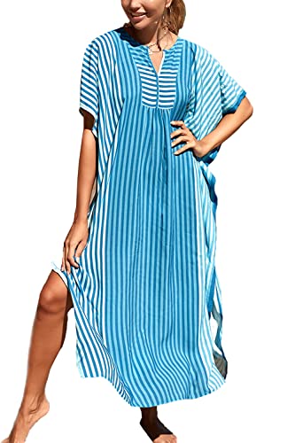 LeofL Abito casual da donna lungo maxi camicia da notte caftano tunica taglia libera, Azzurro, Taglia unica