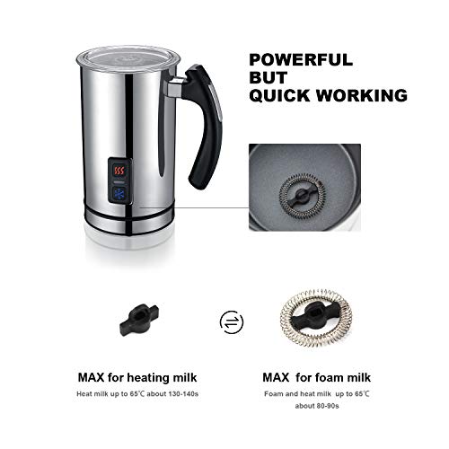 ✅ Multiuso: Progettato con due pulsanti, uno è per schiumare il latte, l'altra è per scaldare il latte Linea MAX superiore utilizzato per riscaldare latte, linea MAX di fondo utilizzato per montare il latte Pratico e sicuro: dispone di un doppio strato di acciaio inossidabile di alta qualità così come di un coperchio resistente al calore e una maniglia per isolare meglio il calore quando si fa schiumare il latte