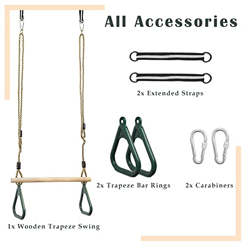 Leogreen - Trapezio in legno, anelli e barra da ginnastica per bambini, verde, 200 cm, moschettone e cintura, materiale: plastica (PP, PE), Accessori: (2X) Ganci (2X) Cinture