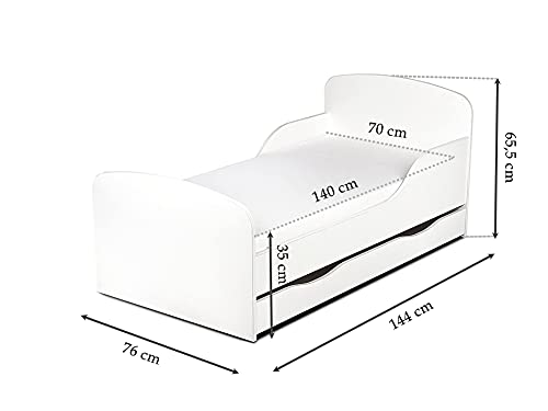 Leomark Letto Lettino per bambini in legno, cassetto cassettone e materasso, rete a doghe, magnifiche stampe, dimensioni del materasso 140 x 70 cm, colore bianco con motivo: UNICORNO Cuori Colorati