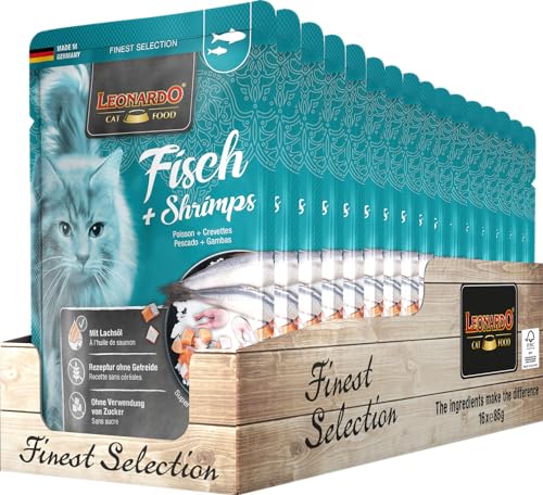 Leonardo Sacchetto salvafreschezza [16x85g Pesce + Gamberetti] | Cibo umido senza cereali per gatti | Alimento completo umido in busta monoporzione