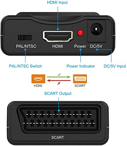 【Schnittstelle für SCART-Ausgang】 Anschluss an HDTV oder Monitor, SCART-Ausgabeformat: Unterstützt die beiden Standard-TV-Formate PAL und NTSC, Umschalten des CVBS-Ausgabeformatis. Wandelt die hohe Qualität des HDMI-Signals in ein normales SCART-Signal um, HDMI-Eingang, SCART-Composite-Video- und Stereo-Audio-Ausgang.