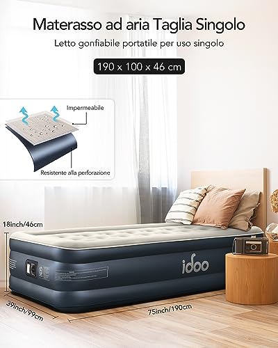 IDOO Letti Gonfiabili,Letto ad Aria Gonfiabile con Pompa Integrata, Gonfiamento/Sgonfiamento Rapido Automatico in 3 Minuti,Superficie Superiore Letto Confortevole,190x100x46cm,Fino a 250Kg(Singolo)