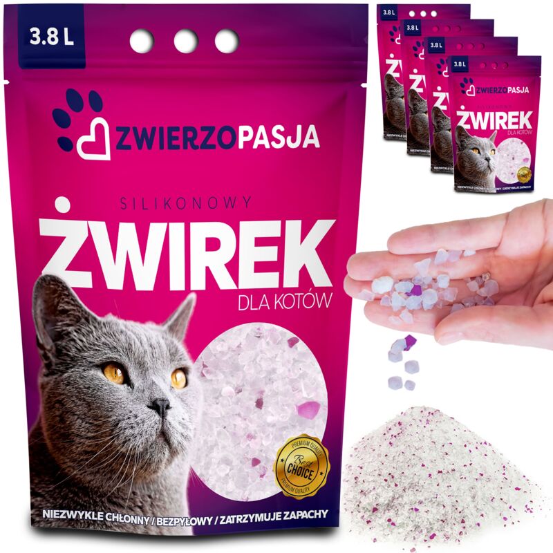 Lettiera per gatti in silicone ZWIERZOPASJA set 5 X 3,8 L 5 confezioni x 3,8 L Comfort e pulizia per il tuo animale domestico! Scopri l'esclusiva lettiera in silicone zwierzopasja, che garantisce il massimo livello di igiene e comfort per il tuo amato animale domestico. La sua formula antibatterica protegge dalle infezioni, e la struttura siliconica garantisce un ottimo potere assorbente e trattiene gli odori sgradevoli, lasciando in cambio un delicato e leggero aroma di fragola. La tua casa sarà piena di freschezza e il tuo animale domestico potrà godere di un ambiente pulito e piacevole. Privo di polvere e a grana grossa, garantisce pulizia e minimizza gli allergeni. Scopri l'incredibile capacità di 3,8 litri, che significa un utilizzo duraturo senza bisogno di ricariche frequenti. La lettiera è naturale e non contiene additivi irritanti, quindi è sicura per il tuo animale domestico e rispettosa dell'ambiente. Fai godere al tuo animale domestico comfort e pulizia grazie alla
