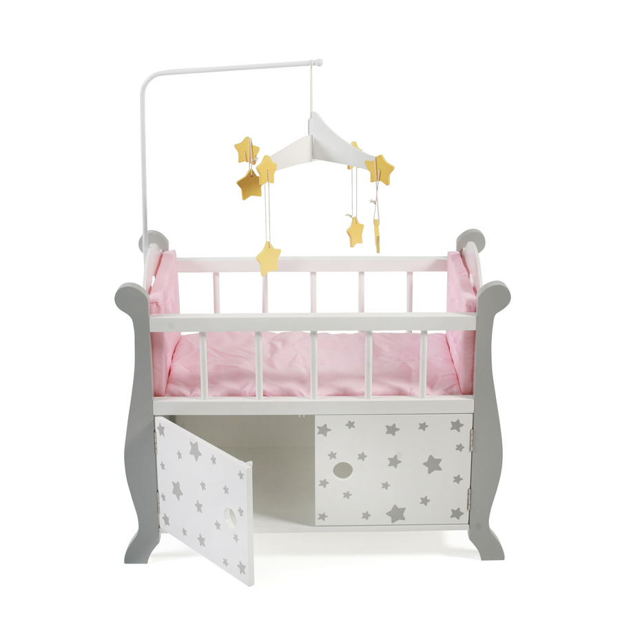 Questo bellissimo letto per bambole è adatto a tutte le bambole fino a circa 46 cm e offre un luogo rilassante per dormire dopo una dura giornata di gioco. Particolarmente carino è il cellulare, che pende sopra il letto. I lati sono morbidamente imbottiti in modo che la bambola sia molto confortevole. Le due ante dell'armadio nella parte anteriore possono essere aperte e offrono molto spazio per gli accessori. Realizzato in MDF ecologico. dettagli del prodotto: Dimensioni (lunghezza x larghezza x altezza): 57 x 31 x 78 cm Dimensione della bambola: max. 46 cm Peso: 4,9 kg Materiale: legno, tessuto Età: a partire da 3 anni <