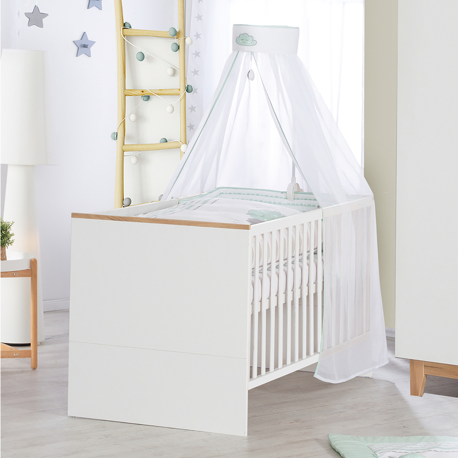 Con il suo elegante look bicolore in quercia dorata e bianco, il lettino combinato roba Finn è l'alto light nella stanza del bambino o del ragazzo. La culla e il lettino di crescita accompagnano il tuo bambino dalla nascita fino all'inizio della scuola. La posizione sdraiata superiore del lettino regolabile in altezza a 3 posizioni è particolarmente facile per voi genitori. Potete facilmente sollevare il vostro bambino dal lettino da questa comoda altezza di sdraio. Più tardi, la posizione intermedia è la scelta perfetta, perché le 3 barre di scorrimento rimovibili nell'elemento del lettino permettono al bambino di entrare e uscire in sicurezza. La posizione più bassa del lettino regolabile in altezza è destinata al letto Junior . Quando il tuo bambino è più grande, il lettino combinato può essere convertito in un letto Junior con pochi semplici passi utilizzando le sponde di conversione che sono disponibili separatamente. La testiera e la pediera del lettino combinato possono essere divise. Quando si converte in un letto Junior, le due metà superiori della testiera e della pediera vengono utilizzate e creano un nuovo look nella stanza dei bambini. Il lettino combinato Finn può essere utilizzato fino a quando il bambino ha 7 anni (o fino a un peso corporeo di 50 kg). Il letto per bambini roba e Junior ha una superficie di sdraio di 70 x 140 cm. Se vuoi trasformare il lettino in un letto a baldacchino, i nostri set da 4 pezzi per lettino roba composti da cuscino, coperta, baldacchino e nido sono ideali. Il lettino combinato roba è sviluppato in Germania e soddisfa gli attuali standard di sicurezza secondo EN 716 - 1:2017 + AC:2019. Il lettino Finn è stato prodotto in UE ed è facile da montare. Inoltre, è certificato eph e porta il sigillo di qualità blue angel, che garantisce che tutti i materiali utilizzati soddisfano i più alti standard per le proprietà ambientali, sanitarie e di utilizzo. Dettagli del prodotto: Colore carcassa: bianco bordi di colore: quercia dora