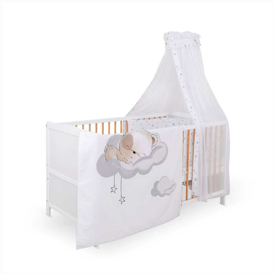 Dettagli del prodotto: Letto completo 8 pezzi Rete a doghe: regolabile in altezza in 3 posizioni (da 12 cm a 32 cm e 45 cm) Letto parzialmente solido Certificato FSC: A000531 Consegna smontata per il montaggio autonomo, le istruzioni di montaggio di facile comprensione consentono un montaggio senza problemi Letto per bambini Dettagli del prodotto: Colore: bianco tinto Regolabile in altezza a 3 posizioni 3 pioli scorrevoli Distanza tra le singole barre: 5,5 cm Trasformabile in letto junior Dimensioni e peso: Superficie di sdraio: 70 x 140 cm Dimensioni: larghezza x lunghezza x altezza 74 x 144 x 80 cm Materiale e cura: Materiale struttura: Pino massiccio Materiale testiera e pediera: pannelli in HDF Materiale rete a doghe: doghe in legno di molle altamente elastiche in multistrato impiallacciato Certificazione FSC: A000531 Materasso Dettagli del prodotto: Materasso in schiuma morbida elastica Rivestimento sfoderabile Dimensioni e peso: Dimensioni: larghezza x lunghezza x altezza 70 x 140 x 7 cm Materiale e cura: Materiale: schiuma morbida PU Rivestimento: 100 % cotone Lavabile a 30 °C Non adatto all'asciugatura in asciugatrice Design S et da letto Dettagli prodotto: Set da 3 pezzi Colore: colorato: coppia di gufiDimensioni e peso: Federa: larghezza x lunghezza 40 x 60 cmCoperta: 100 x 135 cmMateriale e cura: Materiale della biancheria da letto: 100 % cotone Lavabile fino a 60 °C, adatto all'asciugatura in tamburo Materiale del nido: 100 % cotone, imbottitura 100 % pile di poliestere Lavabile fino a 30 °C, non adatto all'asciugatura in tamburo Materiale del tettuccio: 100 % voile di poliestere Lavabile fino a 30 °C, non adatto all'asciugatura in tamburo Incluso nella fornitura: Culla materasso rete a doghe 4 blocchi di conversione Palo del baldacchino in metallo Set letto da 3 pezzi: lenzuola, nido e baldacchino Nota bene: il cuscino e il piumone non sono inclusi.