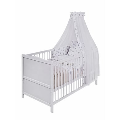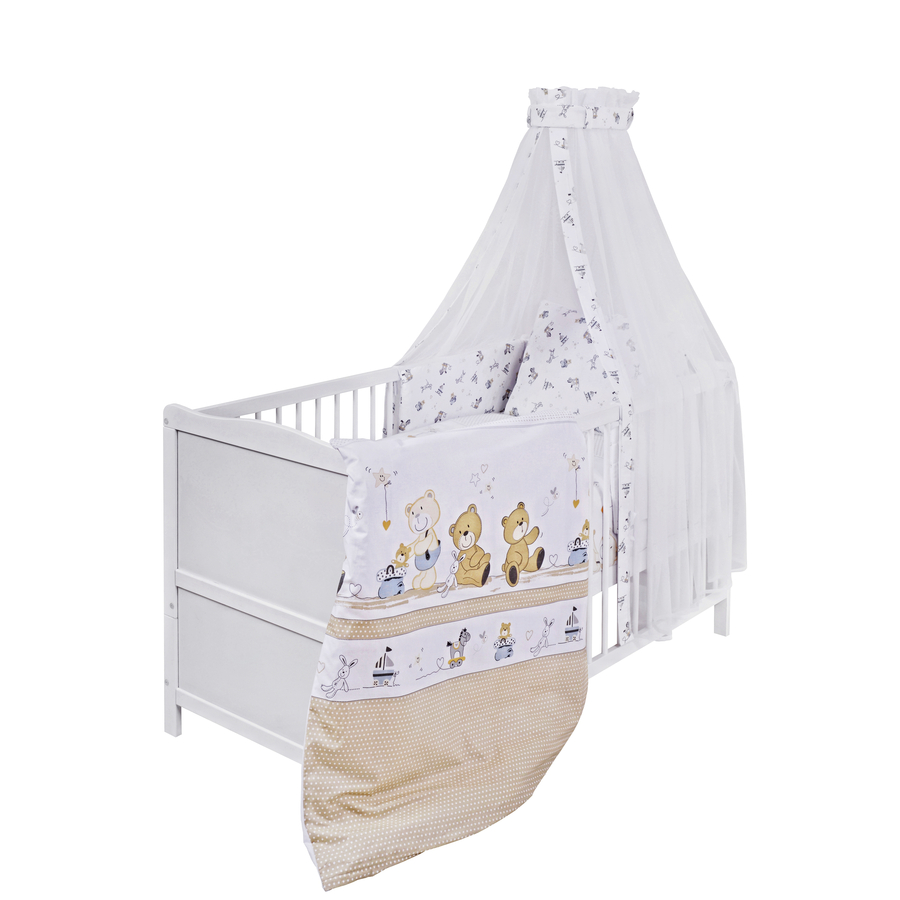 Questo letto completo farà dormire profondamente e comodamente il vostro bambino. Il letto è fatto di pino massiccio e può essere convertito in un lettino Junior . Dettagli del prodotto: Cot: Colore: bianco Materiale del telaio: pino massiccio Materiale testata e parte posteriore: tavole HDF Materiale del telaio a doghe: doghe in legno altamente elastiche in compensato impiallacciato Superficie di sdraio: 70 x 140 cm Dimensioni: larghezza x lunghezza x altezza 74 x 144 x 80 cm 3 volte regolabile in altezza 3 pioli di scorrimento Distanza tra le singole barre: 5,5 cm Convertibile in lettino Junior Materasso: Materiale: nucleo in schiuma morbida 100% PU Superficie di sdraio: larghezza x lunghezza x altezza 70 x 140 x 7 cm Materiale: copertura 100% cotone Copertura rimovibile e lavabile Set di 3 pezzi: Colore: bianco / multicolore Design: play bear Biancheria da letto (cuscino 40 x 60 cm / coperta 100 x 135 cm): 100 % cotone Paracolpi: Tessuto di rivestimento 100% cotone, imbottitura in pile 100% poliestere Baldacchino: 100% poliestere voile Asta del baldacchino: metallo/li> Biancheria da letto lavabile fino a 60° C, adatta all'asciugatrice Baldacchino e paracolpi lavabili fino a 30° C Incluso nella consegna: Lettino Telaio a doghe 4 blocchi di conversione Materassino Set di biancheria da letto Paracolpi Asta del baldacchino Baldacchino Nota bene: il cuscino e la coperta non sono inclusi nella consegna.
