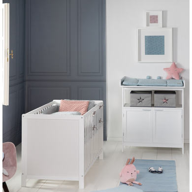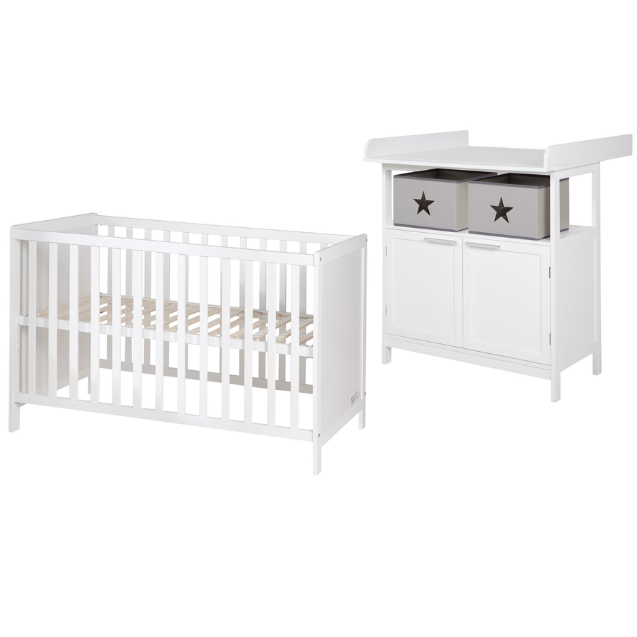 Roba Il set per la cameretta è composto dal fasciatoio Hamburg e da una culla/lettino regolabile in altezza. L'unità fasciatoio con attacco rimovibile per il cambio dei pannolini ha un'altezza confortevole di 92 cm, che rende la cura del bambino un piacere sia per i genitori che per il bambino. Il fasciatoio con telaio di alta qualità è verniciato con vernice bianca a base d'acqua e si integra in qualsiasi ambiente grazie al suo design discreto. La superficie fasciatoio è adatta a materassini fino a 85 x 75 cm. Le 2 scatole di tela nel vano aperto tra il piano fasciatoio e le ante consentono di avere a portata di mano tutto il necessario per la cura del bambino. Dietro le 2 porte con moderne maniglie argentate si trova lo spazio per gli utensili per il cambio. Il fasciatoio è un vero e proprio tuttofare e vi servirà per molti anni. Una volta rimosse le parti del piano, il fasciatoio si rivela una cassettiera senza viti visibili nel pannello superiore. Il fasciatoio è facile da montare ed è dotato di protezione antiribaltamento. roba La culla è regolabile in altezza e può essere utilizzata come letto aggiuntivo grazie ai 5 pioli rimovibili dell'elemento reticolare. Il lettino può essere fissato saldamente al pannello laterale (spessore massimo 4,5 cm) del letto dei genitori da un'altezza di 22 cm fino a 42 cm. Inserendo i pioli, è possibile trasformare il lettino in una culla per il bambino. In seguito, si può consentire al bambino di salire e scendere dal letto in tutta sicurezza, lasciando le barre di sicurezza. roba Il fasciatoio Hamburg è stato sviluppato in Germania ed è conforme agli attuali standard di sicurezza secondo la norma EN 12221 - 1+2:2008 + A1:2013. La culla è stata sviluppata in Germania ed è conforme agli attuali standard di sicurezza secondo la norma EN 716 - 1:2017 + AC:2019. Dettagli del prodotto: Lettino combinato Colore: bianco Materiale della scocca: Faggio, laccato Materiale superficie di riposo: Telaio a doghe in compensato Materiale sponde