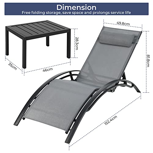 2 Lettino Prendisole e set da Tavolo, Lettino Relax, Sedia da Giardino con Cuscino Sfoderabile, Sdraio in Alluminio con Schienale Regolabile in 5 Direzioni per Giardino,Cortile,Balcone,Piscina,Grigio