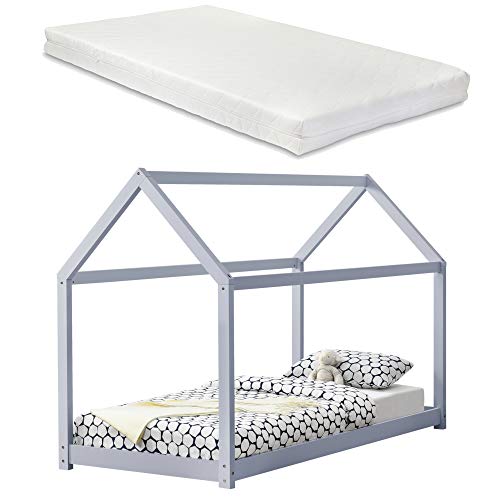 Letto per Bambini 200 x 90 cm con Materasso a Schiuma Fredda Design Casa Piccola Lettino di Legno di Pino Grigio Chiaro Opaco