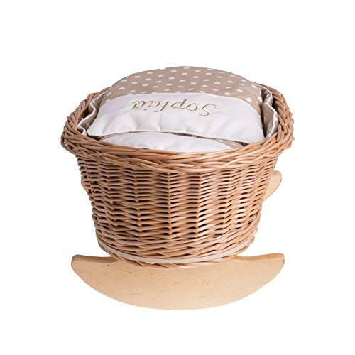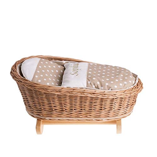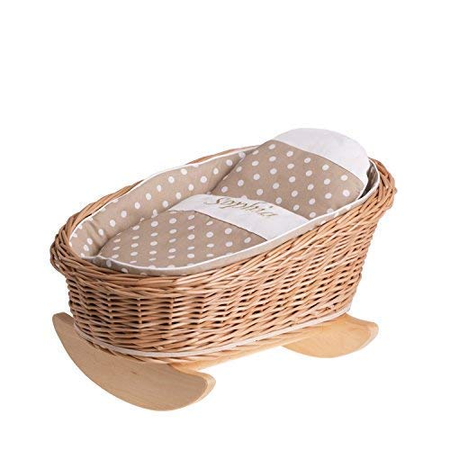 Un letto a dondolo, una culla a dondolo, una griglia a dondolo in vimini con nome delle bambole