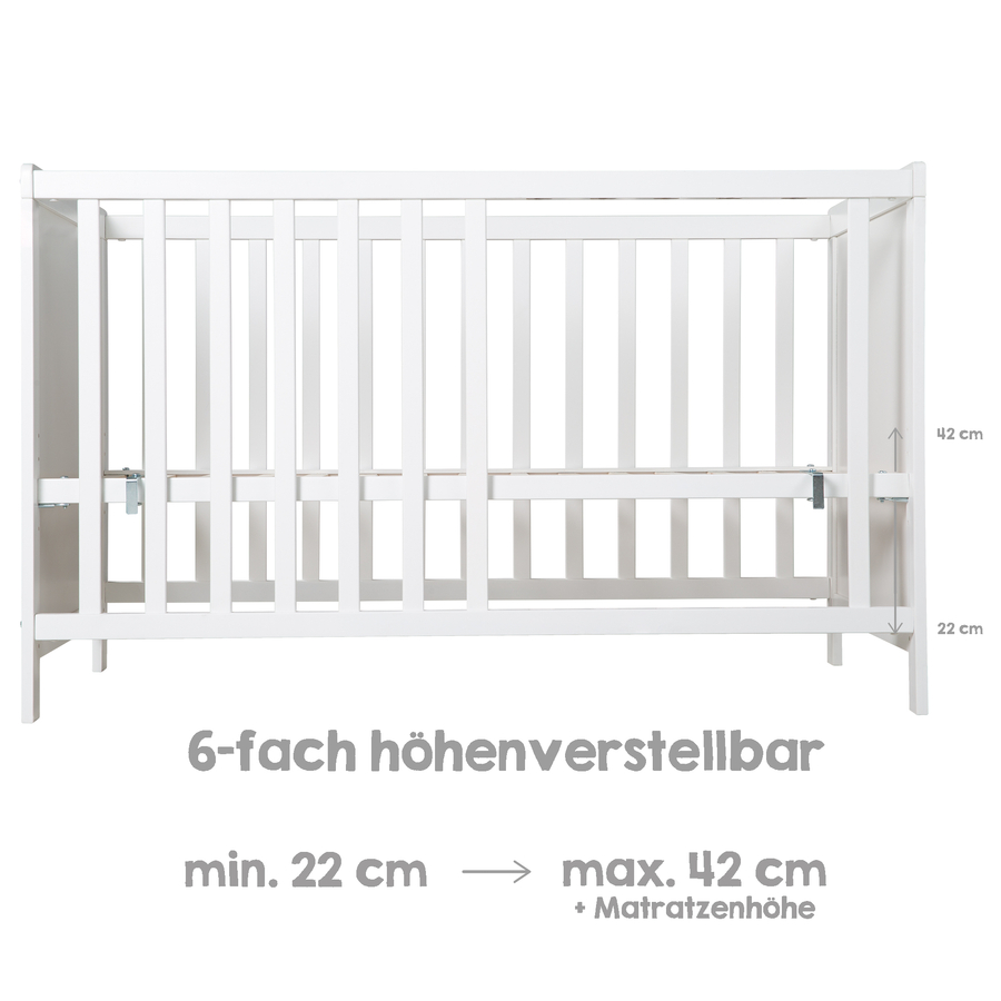Il letto supplementare roba è regolabile in altezza e può essere utilizzato come letto aggiuntivo al letto dei genitori grazie ai suoi 5 pioli estraibili nell'elemento culla. La culla 60 x 120 cm può essere fissata in modo sicuro alla parte laterale (spessore massimo 4,5 cm) del letto dei genitori da un'altezza di 22 cm fino a un'altezza di 42 cm. La culla può essere equipaggiata con i set da 4 pezzi roba composto da cuscino, coperta, baldacchino e nido in molti diversi Design s e quindi si adatta a qualsiasi cameretta con la sua semplicità senza tempo Design . Con le barre di scorrimento inserite, puoi trasformare il letto a scomparsa in una culla per il tuo bambino. In seguito, puoi permettere al tuo bambino di entrare e uscire dal lettino in modo sicuro lasciando fuori i pioli di scorrimento. Il letto a scomparsa roba è progettato in Germania ed è conforme alle ultime norme di sicurezza secondo EN 716 - 1:2017 + AC:2019, è facile da montare e certificato eph. Il letto supplementare roba con rete a doghe ha una superficie di sdraio di 60 x 120 cm. Dettagli del prodotto: Può essere usato come letto laterale (spessore massimo del pannello laterale 4,5 cm) la superficie di sdraio è regolabile in altezza per 6 volte 5 pioli antiscivolo rimovibili Dettagli tecnici: Colore: bianco Materiale: compensato, verniciato superficie di appoggio: larghezza x lunghezza 60 x 120 cm Dimensioni (HxLxP): 76 x 66 x 121,5 cm. Altezza delle doghe regolabile da min. 22 cm a max. 42 cm Incluso nella consegna: Letto extra Telaio a doghe Materasso