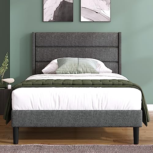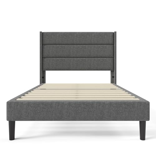 Letto imbottito singolo, 90 x 200 cm, con rete a doghe e testiera, rivestimento in tessuto di lino, colore: grigio scuro, design moderno senza tempo, letto per ragazzi