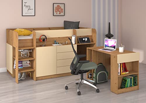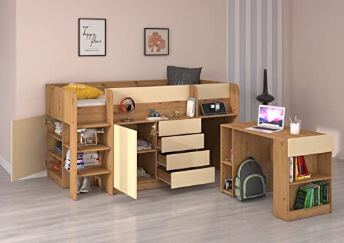 Letto rialzato “Smile L” per bambini, set di mobilio per la cameretta dei bambini, composto da un letto con scrivania, mensole e cassetti: lato sinistro (rovere artigianale/ crema)