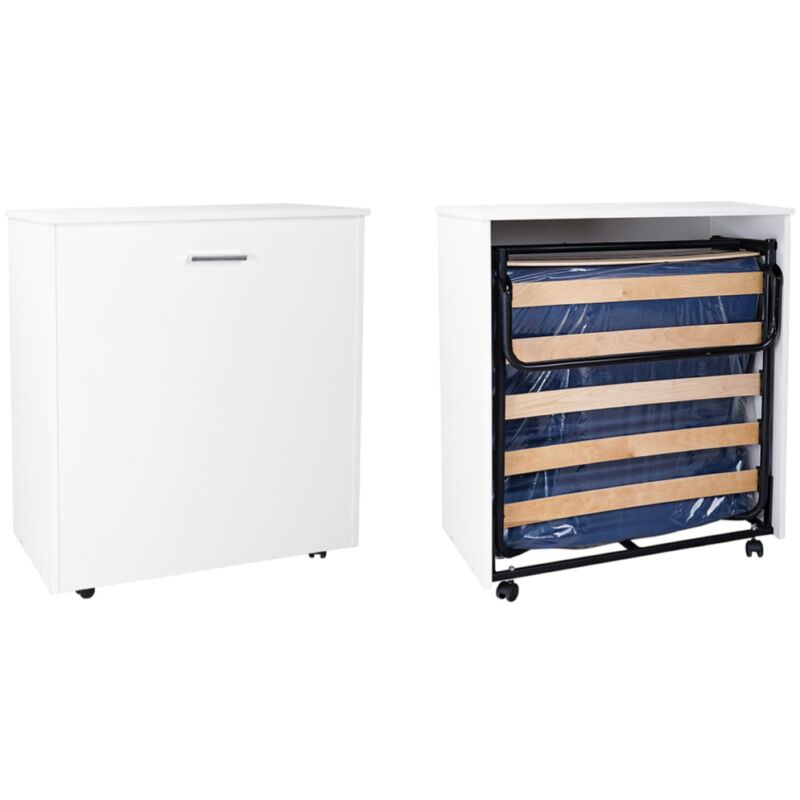 Questo mobile letto richiudibile e' un utilissimo complemento per una seconda casa, per un monolocale in cui si desideri un posto letto in piu', o per ospitare gli amici dei vostri bambini in cameretta. Facile da spostare da una stanza all'altra grazie alle sue 4 ruote piroettanti. Questo letto pieghevole una volta richiuso si presenta come una semplice e finta cassettiera in finitura Bianco.Sara sufficiente ruotarlo di 180 gradi per svelare la struttura con rete a doghe completa di materasso singolo da 80 cm x 180 cm con altezza di 10 cm. Dimensioni: Larghezza 86 cm / Profondita' 46 cm / Altezza 100 cm Apertura totale: Profondita' 215 cm Materasso: 80x180 altezza di 10 cm (incluso)
