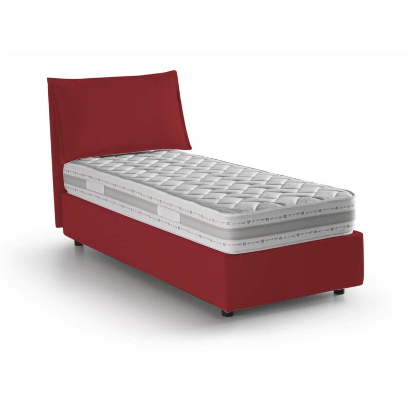 LETTO SINGOLO EVELYN - Letto contenitore con rivestimento in tessuto, 100% Made in Italy, Apertura frontale, con materasso Cm 90x200 incluso, Rosso. STRUTTURA - La struttura del letto è in fibra di legno rialzata da terra con piedini in ABS ed è rivestita in tessuto di poliestere sfoderabile e lavabile in lavatrice a 30° - La testiera lineare abbinata in tessuto con cuciture a vista, è solida e resistente - La rete a doghe in legno multistrato è inclusa nella struttura - Meccanismo di apertura in ferro - L'aggiunta del pratico box salvaspazio permette al letto di trasformarsi in uno spazioso cassone per lenzuola, cuscini e piumoni. MATERASSO INCLUSO - Materasso ortopedico sfoderabile, anatomico, climatizzato a doppia portanza da 90x200 altezza 21 cm - Struttura in massello di poliuretano espanso h 17 cm, densità 30EP ricoperta da una schiuma viscoelastica in Memory Foam h 2 cm, densità 55EP losangata nella parte superiore - Rivestimento in tessuto stretch da gr 130, sfoderabile e