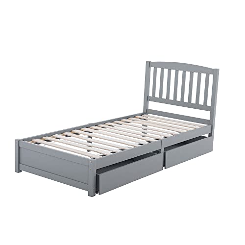 Letto singolo 90 x 200 cm, in legno massello di pino con 2 cassetti, testiera e rete a doghe (grigio)
