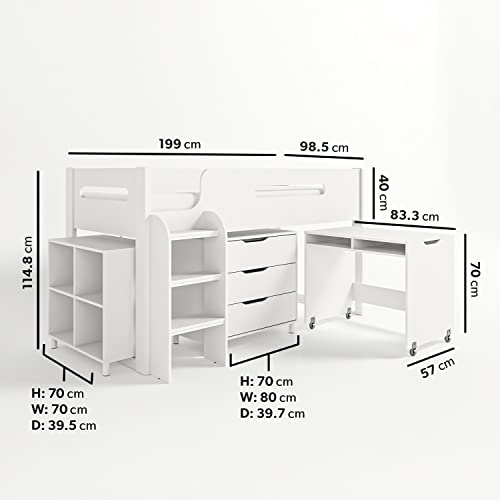 Letto a soppalco, con scala che può essere montata su entrambi i lati, colore: bianco. Con scrivania e cassetti