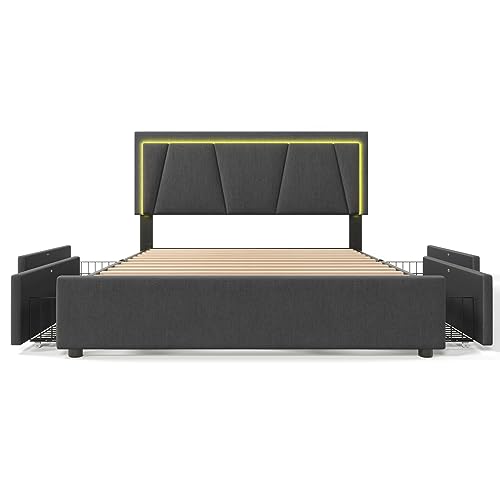 Letto a tappezzeria con illuminazione a LED e 4 cassetti, testiera regolabile in altezza, letto matrimoniale da Memoria da letto, cornice a doghe in legno, grigio (senza materasso) (140x200cm,)