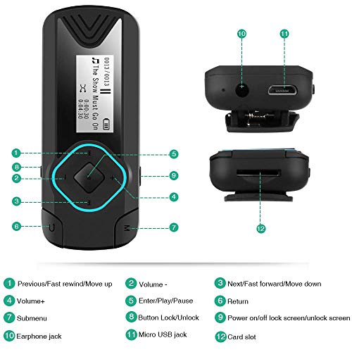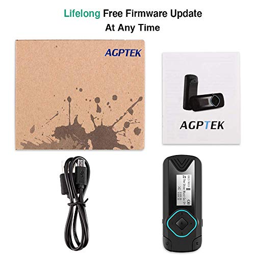 Clip Lettore MP3 Mini 8GB, AGPTEK R3 Lettore Musicale Mp3 Portatile per Jogging Mp3 Dispositivo con Schermo 1.0", Radio FM, Registrazione Vocale VOR, Segnalibri ecc, Nero