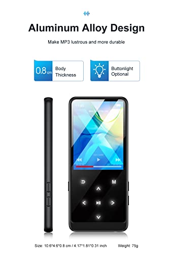 Lettore MP3 da 32 GB con Bluetooth 5.2, Lettore MP3 Portatile con Musica Senza Perdita di Dati, Radio FM, Registratore Vocale, E-book, MP3 Super Leggero in Metallo per lo Sport